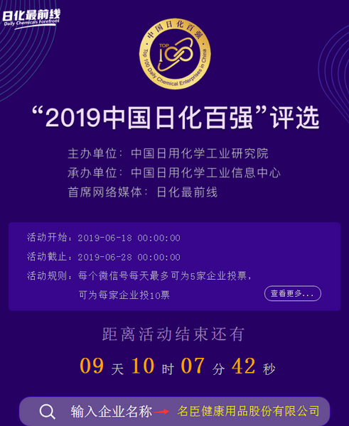 由中国日用化学工业研究院主办的“中国日化百强”评选活动正在进行中,名臣健康用品股份有限公司,经主办方审核确认,进入推荐网络投票的企业名单,请您关注和支持名臣健康评选活动,为我们投上您宝贵的一票。谢谢!